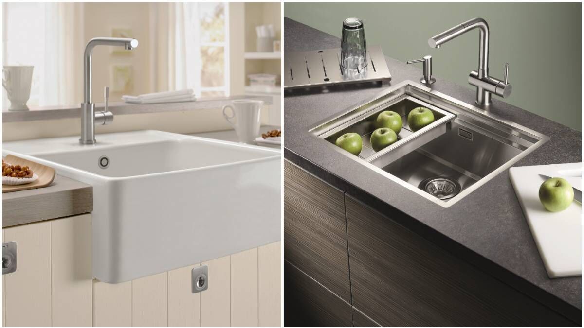 Left, traditional earthenware and ceramic sinks are relatively easy to keep clean with a daily wipedown, Villeroy & Boch Butlers sink; right, Pyramiss make both composite and stainless-steel ledge sinks that may contain a variety of materials which require different cleaning. approaches.