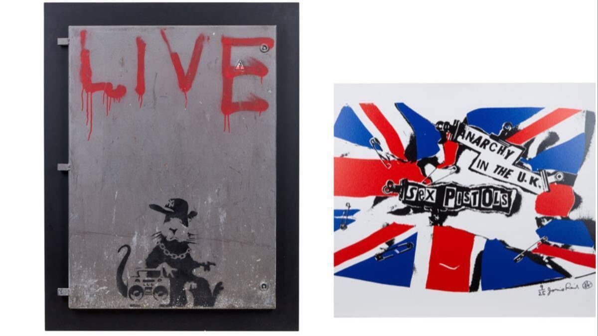 'Gangsta Rat Live' by Banksy at Julien's, left; Jamie Reid-signed 'Sex Pistols Anarchy in the UK' print at Julien's, right.