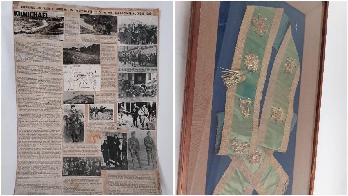 A newspaper report of the Kilmichael ambush, left, and a Fenian sash at Victor Mee.