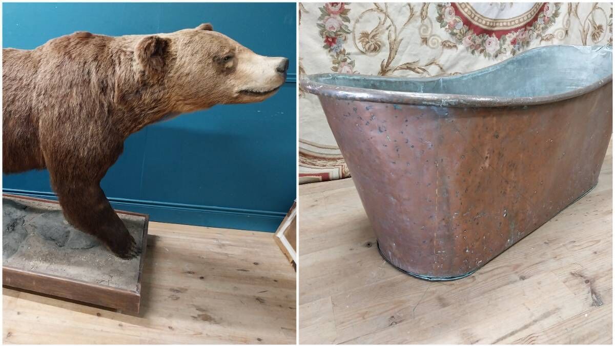 A 19th-century lif- size taxidermy brown bear, left, and a French copper bathtub at Victor Mee.