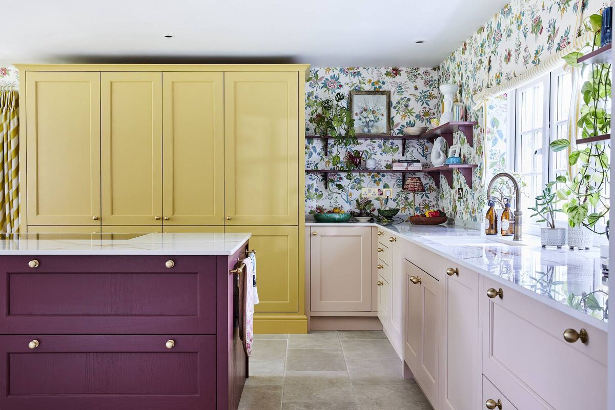Her Shaker kitchen — in shades of yellow, aubergine and pink — features fabric and wallpaper from her own collection with Harlequin across walls, sofas, cushions, and curtains.