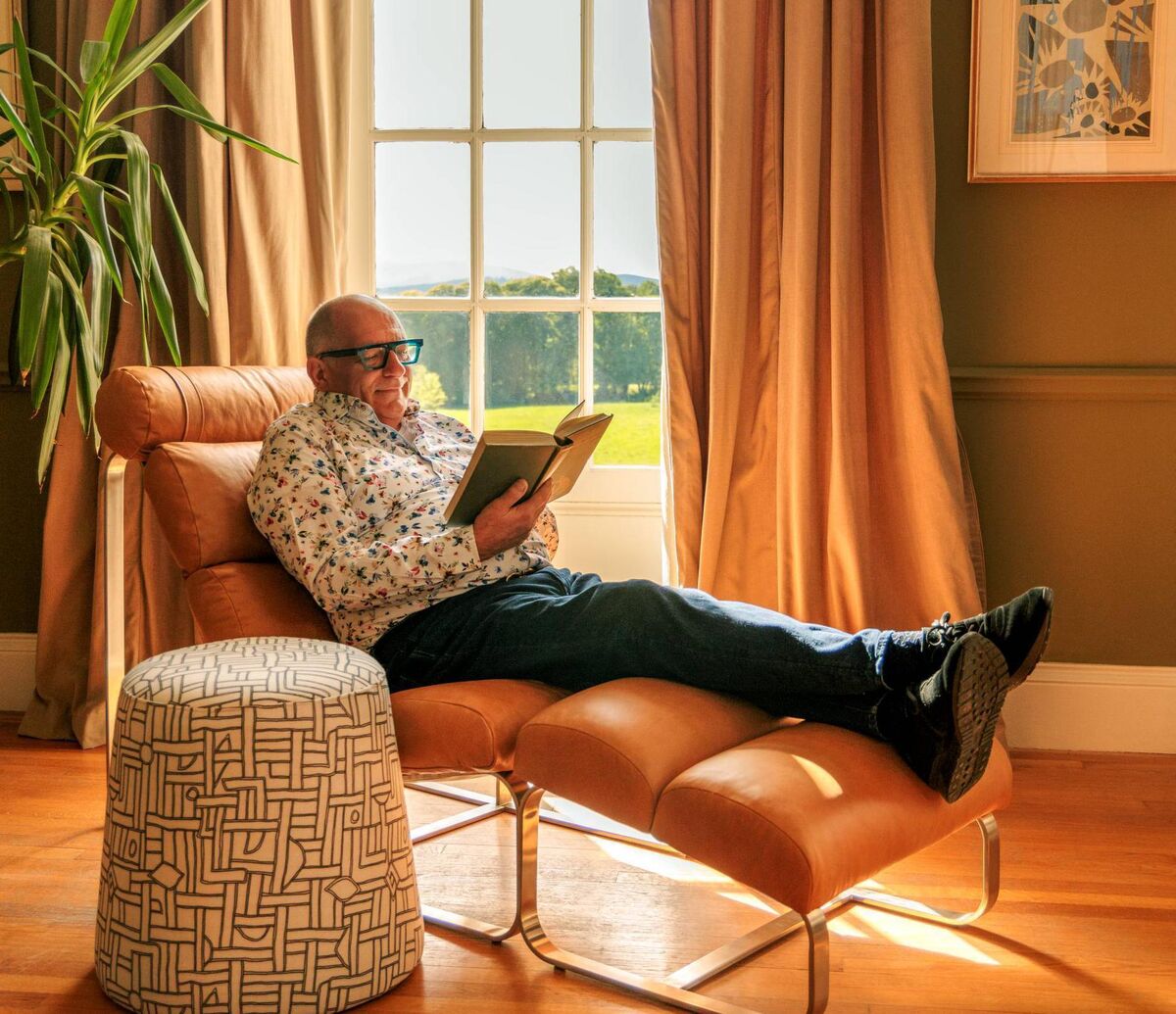 Hugh Wallace relaxes on the Fergus chair, from the Sofa Workshop x Hugh Wallace collection for EZ Living Interiors, top right, Beder outdoor storage box, Jysk, below right, plant pot, TK Maxx.