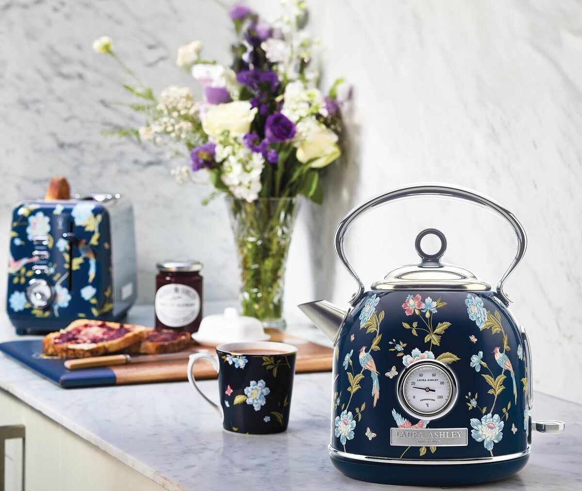 They're available in various Laura Ashley prints, the jug kettle, stove top kettle and 1.7l kettle options boast fast boiling capabilities and safety features, but our favourite is this hand-applied Elveden print in midnight navy.