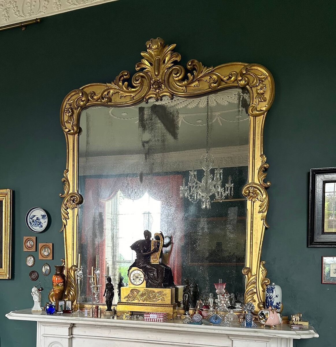 Left, a neoclassical urn, top right, a large gilt overmantel, and bottom right, a pair of 18th-century console tables at Sheppard's.