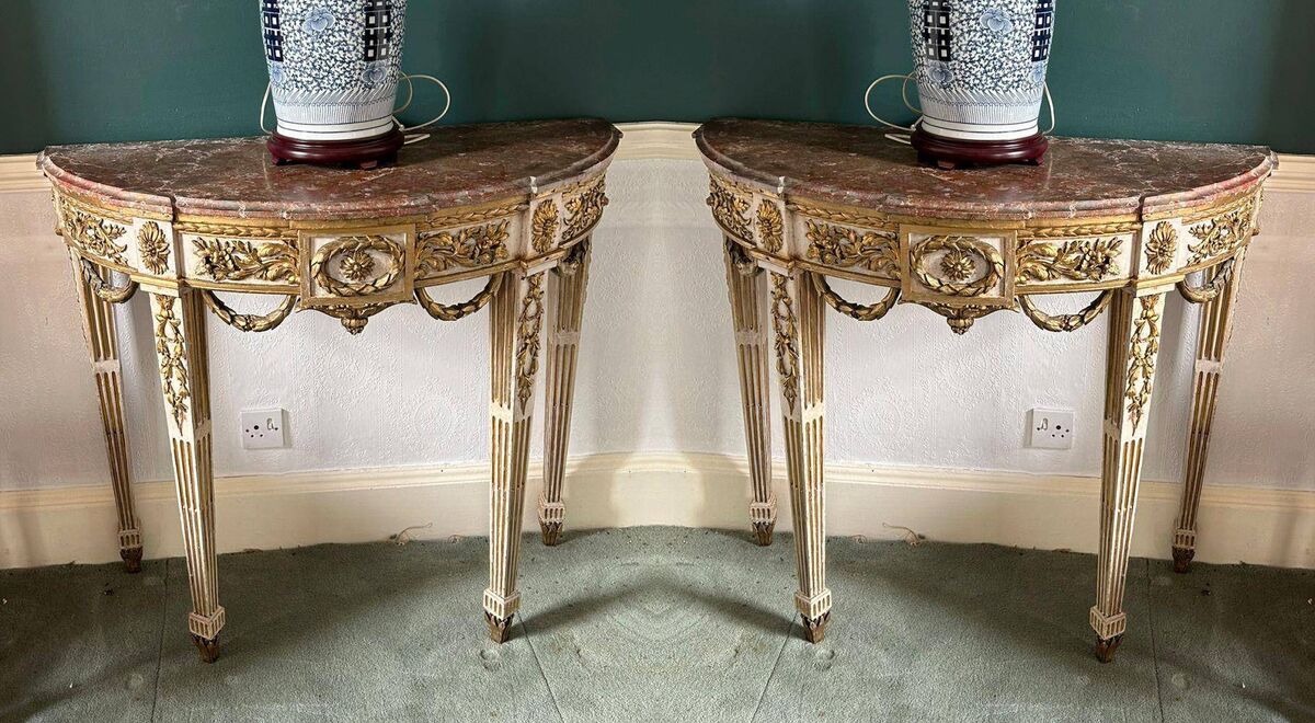 There is a pair of 18th-century parcel gilt console tables (€5,000-€8,000), a 19th-century large carved giltwood overmantel mirror and an 18th-century Dublin longcase clock by William Edwards (both €3,000-€5,000), a c1820 French Restoration ormolu and bronze mantle clock (€1,500-€2,500) and a large Cork Regency brass fender (€1,400-€1,800).