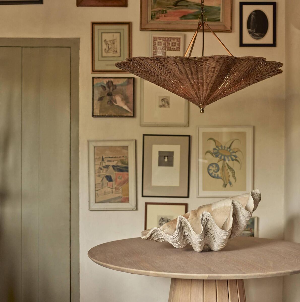 Inspired by the silhouettes of shells, Athena’s sculptural scallop-edged chandelier is handwoven from natural rattan.