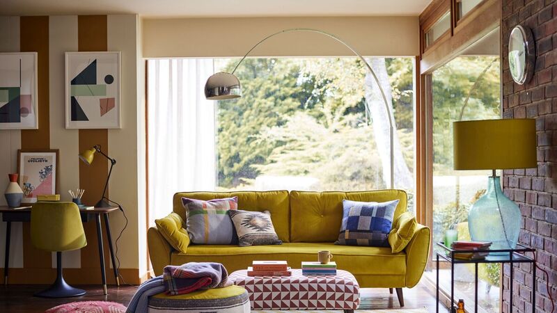 Autumnal ochre features in this DFS sofa, desk chair and lamp shade are accented throughout the room with brown, tan and blue.