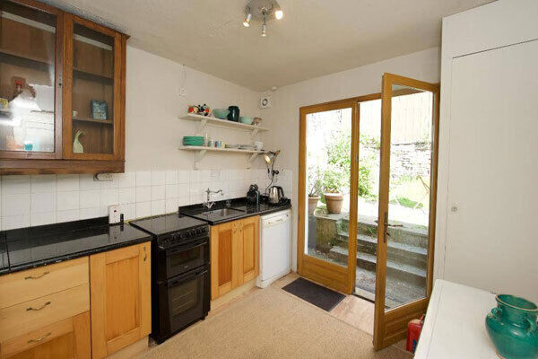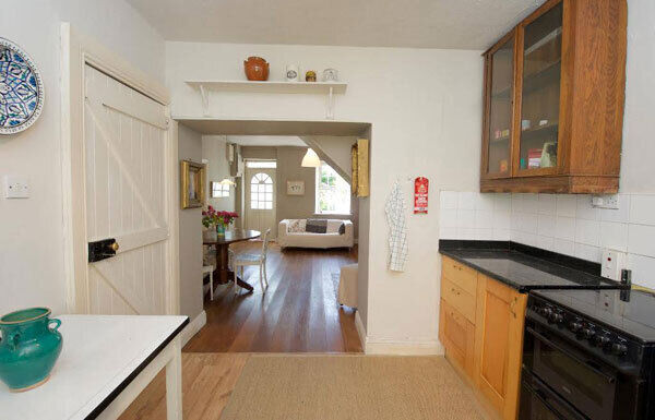 There’s an easy flow from the main living space to the rear kitchen via an open arch, with a straight run of Shaker-style units.