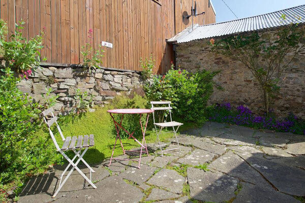 The rear patio/garden with stone flags can be accessed via glazed double doors: it’s a sun trap for evening heat, says Mr Moore, and is sheltered from the north by a high stone wall and timber structure boundary, which is part of a quirky neighbouring home’s structure.