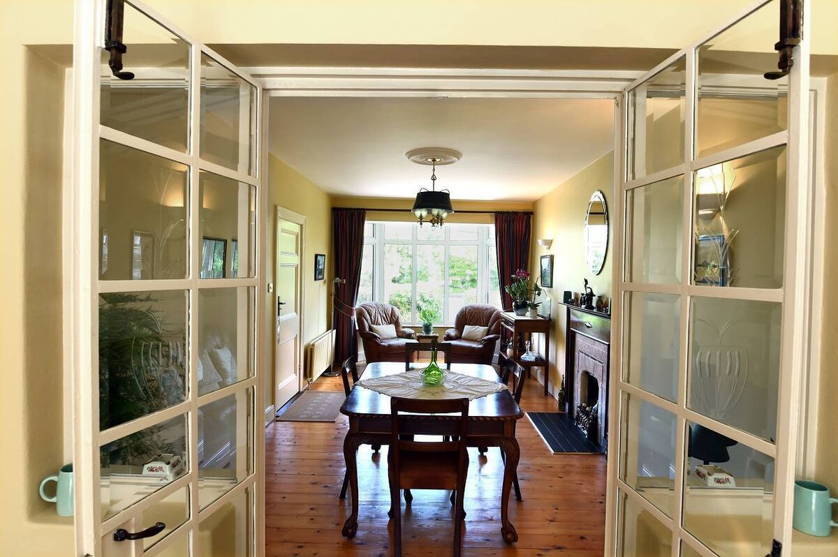 Among some lovely features is a set of original French doors with bevelled glass between the dining room and the living room. The doors had originally opened onto the garden until the father added the living room in the course of his 1940s extension.