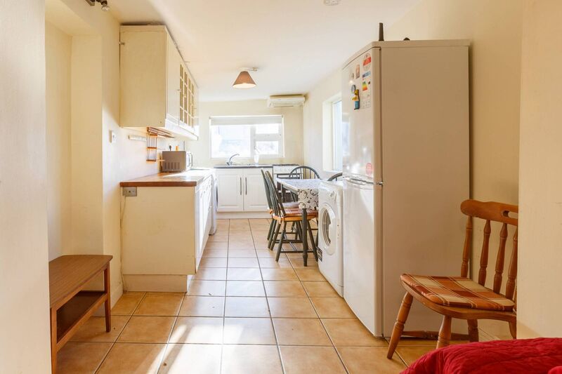 The pretty blue front door opens into a high-ceilinged living/dining room, with an electric stove and a rooflight. Beyond this is a small kitchenette, a bathroom and two bedrooms, including one very small one. From the kitchen, thereâs a door that opens out on to a patio garden.