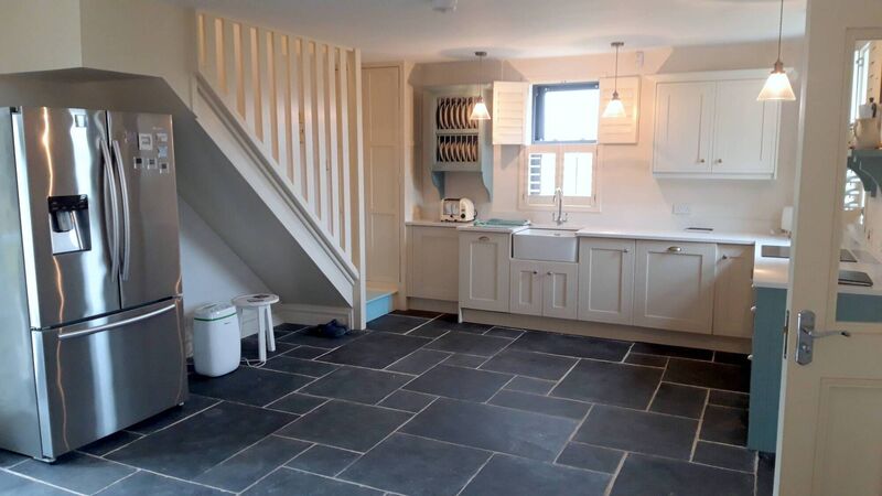 The kitchen-living-dining area is picture-perfect with hand-painted country-style kitchen units with quartz worktops, modern Neff appliances, and a Belfast sink as well as a fireplace with a rustic mantle and a stove in the living area.