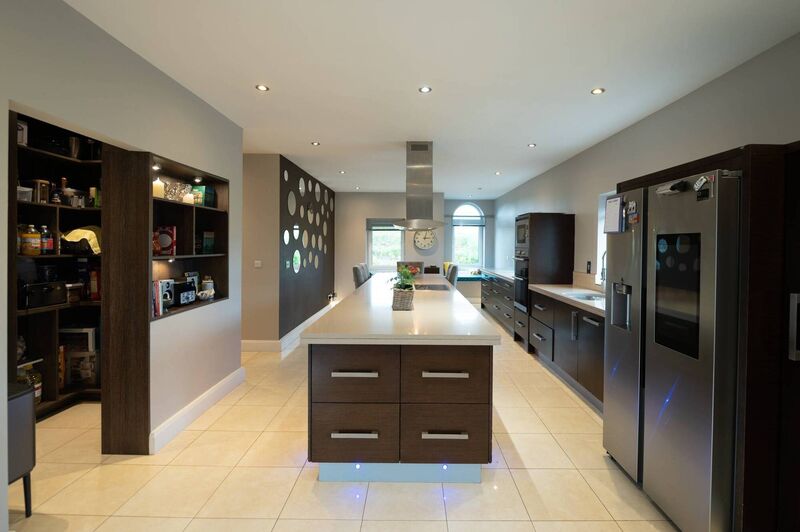 Off to the far left is a huge kitchen/family dining room, with a long central island and units with white stone worktops all on one side, with a walk-in pantry/bar on the opposite side.