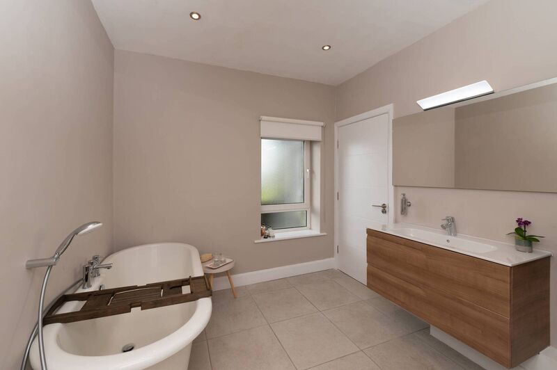 The undisputed main bedroom is away at the house’s very far end, almost apartment sized, with feature arched window with louvre shutters overlooking the back garden. It has a big dressing room/walk-in robe, fully railed and shelved in oak. The private bathroom, meanwhile, is tiled, with a double-ended free-standing bath and what’s describe by Sherry FitzGerald as a cavern shower enclosure, with elaborate rainfall shower.