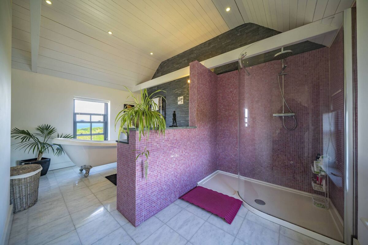 The upshot of the restoration work in the old wing was to create a gorgeous, cosy sitting room with inglenook fireplace and stove downstairs, and a fine main bedroom upstairs, with a walk-in wardrobe and deluxe ensuite, fitted out with striking Valentia slate and violet-pink tiling.