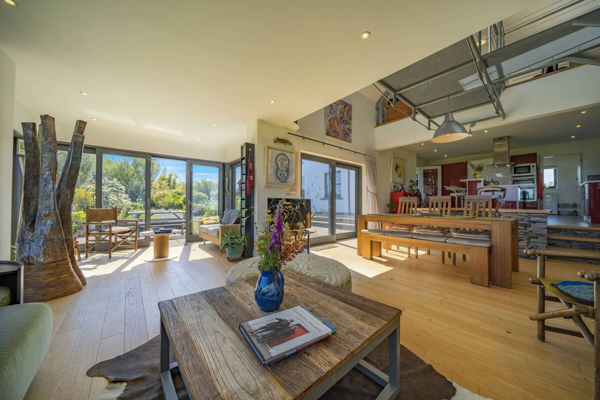 Above the gorgeous curve of the ash staircase, made by a local craftsman, is a circular window, like a porthole, bringing light right through. There are several veluxes at mezzanine level, along with that big apex window, and downstairs is another light-filled space, thanks to flood-to-ceiling glazing at the bayward-facing end of the living room, as well as sliding double doors to a patio.