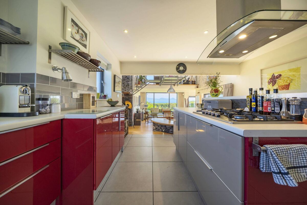 Jutting outwards from the new wing at the bayward end - and part of the open plan layout - is a sunroom with extensive glazing on all three sides, also with double doors to the patio. Towards the rear of this room is another beautiful curved feature wall of Valentia slate, at elbow height, sat into three steps on either side that lead to the flamboyant red and white kitchen (surely a controversial colour choice in South Kerry, even for a Dubliner? Or perhaps a conversation starter?). The owner estimates they spent about €20,000 on the Valentia Slate, both inside and out.