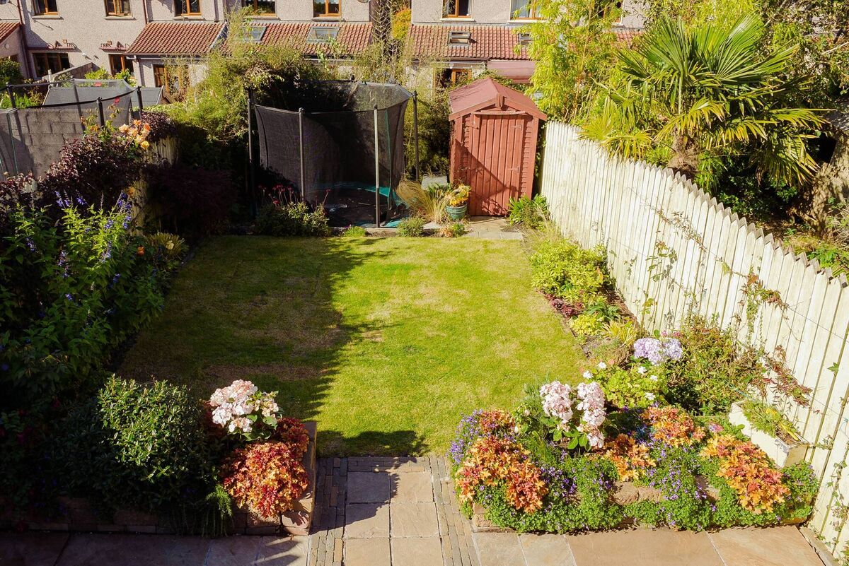 Immediately outside the patio doors is an Indian sandstone paved area, perfect for outdoor dining. Expertly planted raised flower beds separate this paved area from the lawn and there’s a trampoline at the far end, in a step-down area, a clever measure to reduce the trampoline’s height. There’s even room for a small garden shed, nestled against the garden fence.