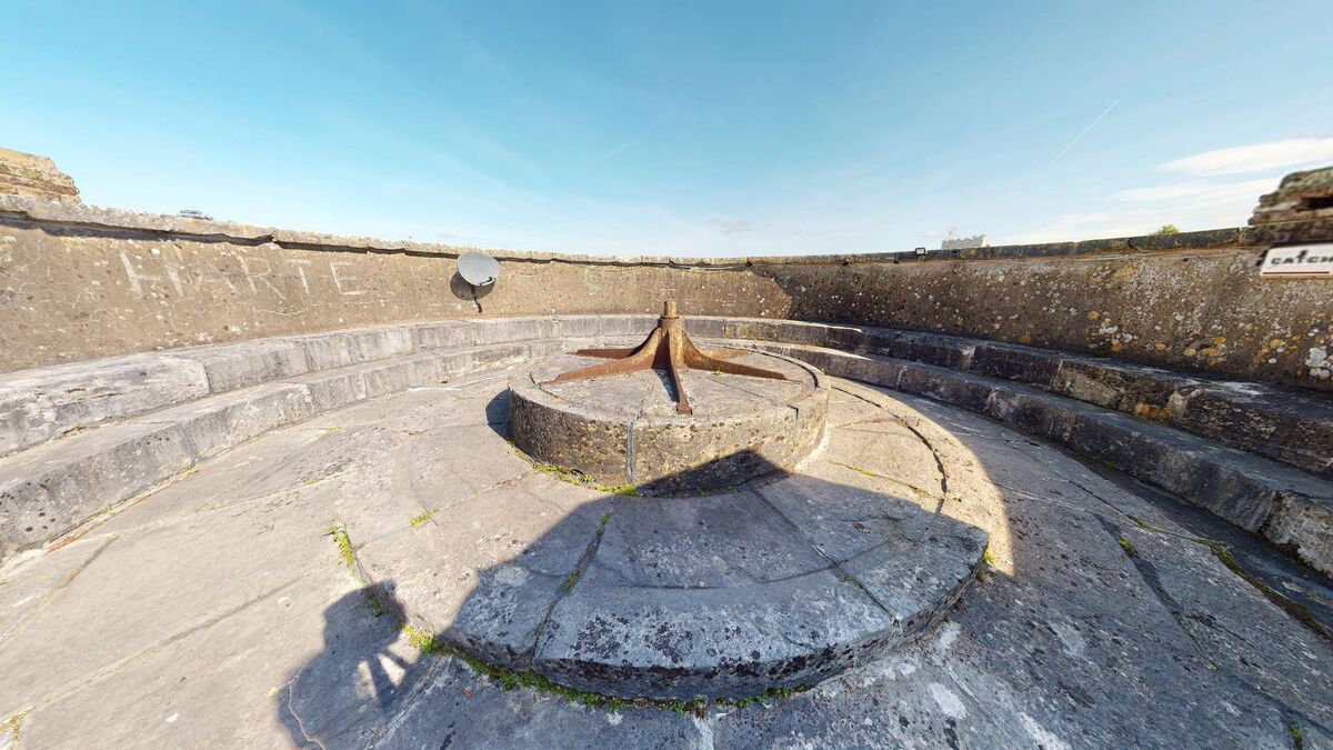 A high parapet surrounds a central raised platform which still has the pivot used to hold a cannon in place.