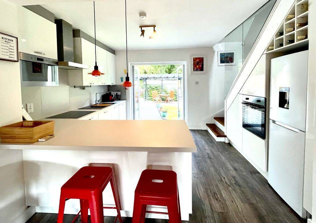 Bathrooms upstairs and downstairs were gutted and renovated and fitted with stylish sanitary ware and they hired a carpenter to make smarter use of under-the-stair space, which they integrated into the kitchen to house a fridge freezer, cooker and custom-made wine-rack.Â