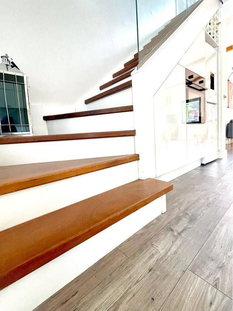 The carpenter also took out the old bannisters and put in white risers and a glass balustrade.