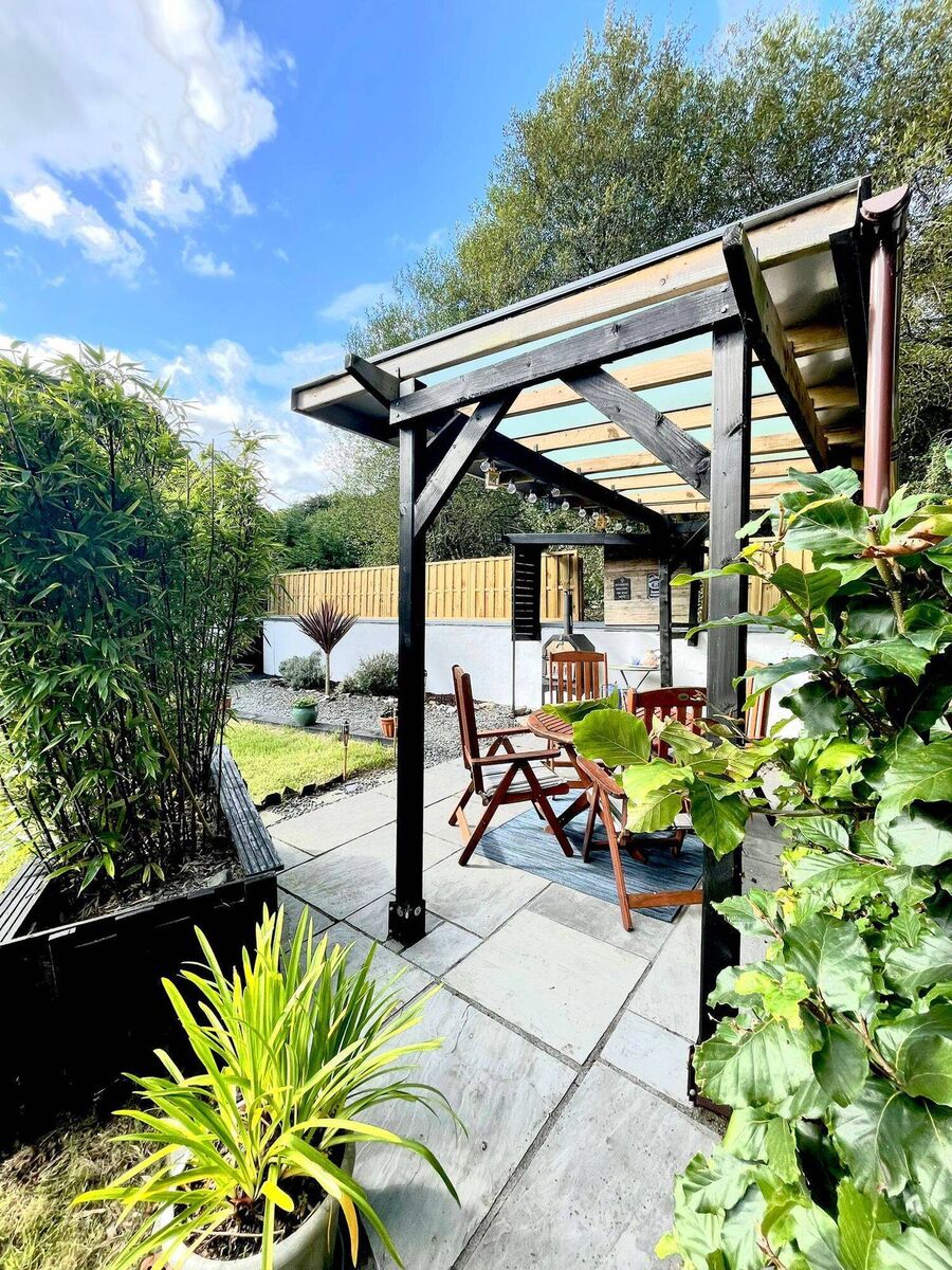 To make it more weather-friendly, they installed a pergola with a glass roof over an Indian sandstone patio, surrounded by lots of greenery. There’s also a steeltech shed.