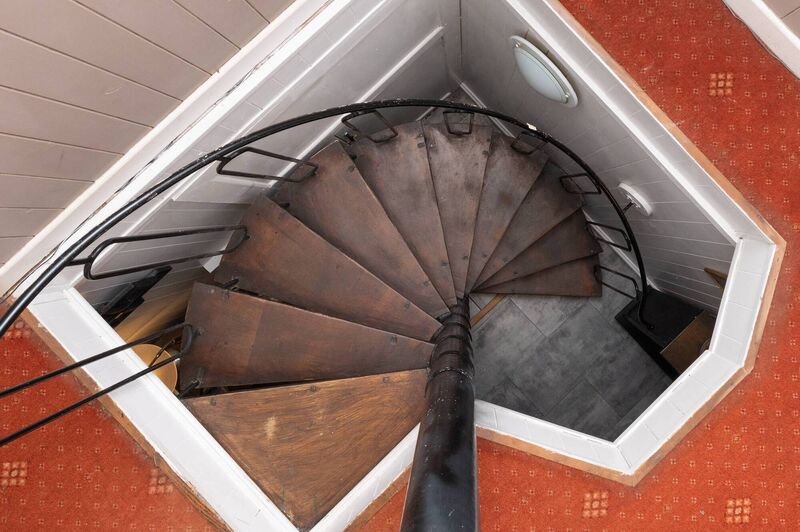 That main lower level also holds a study/hall in the midsection with spiral stairs up to the main entry hall above, and the far end from the kitchen holds not just one, but two bathrooms, one with a freestanding bath in a large room by a painted brick arch. The other has a shower.