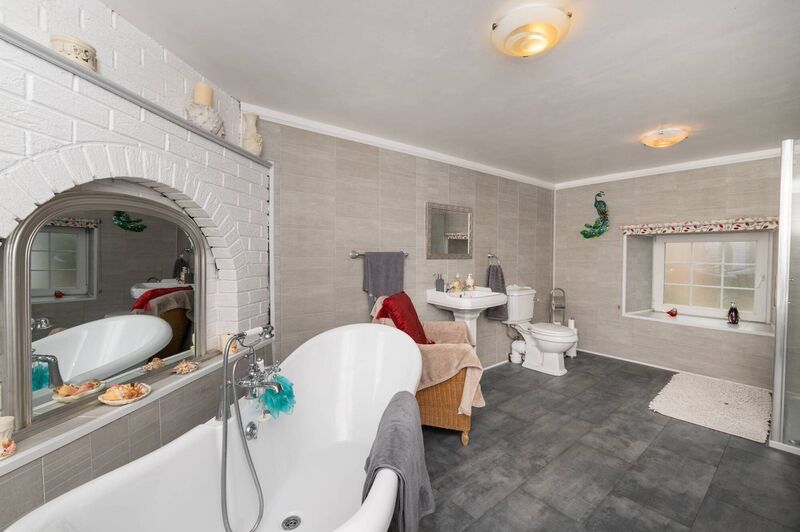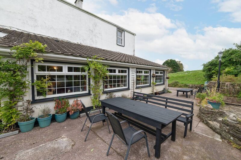There are a few access points to the gardens from this lower ground level, but the more formal or main entrance is up steps to a tiled terrace/raised patio and sit-out area, with an arched front door and glazed panels on either side of the door.
