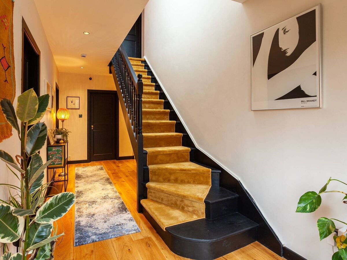 Flooring is all-new, either hardwood or tiles, with a mustard coloured carpet on a reordered and black-painted stairs, again adapted at its lower treads by the builders after they took down an unnecessary partition wall between the porch and hall.
