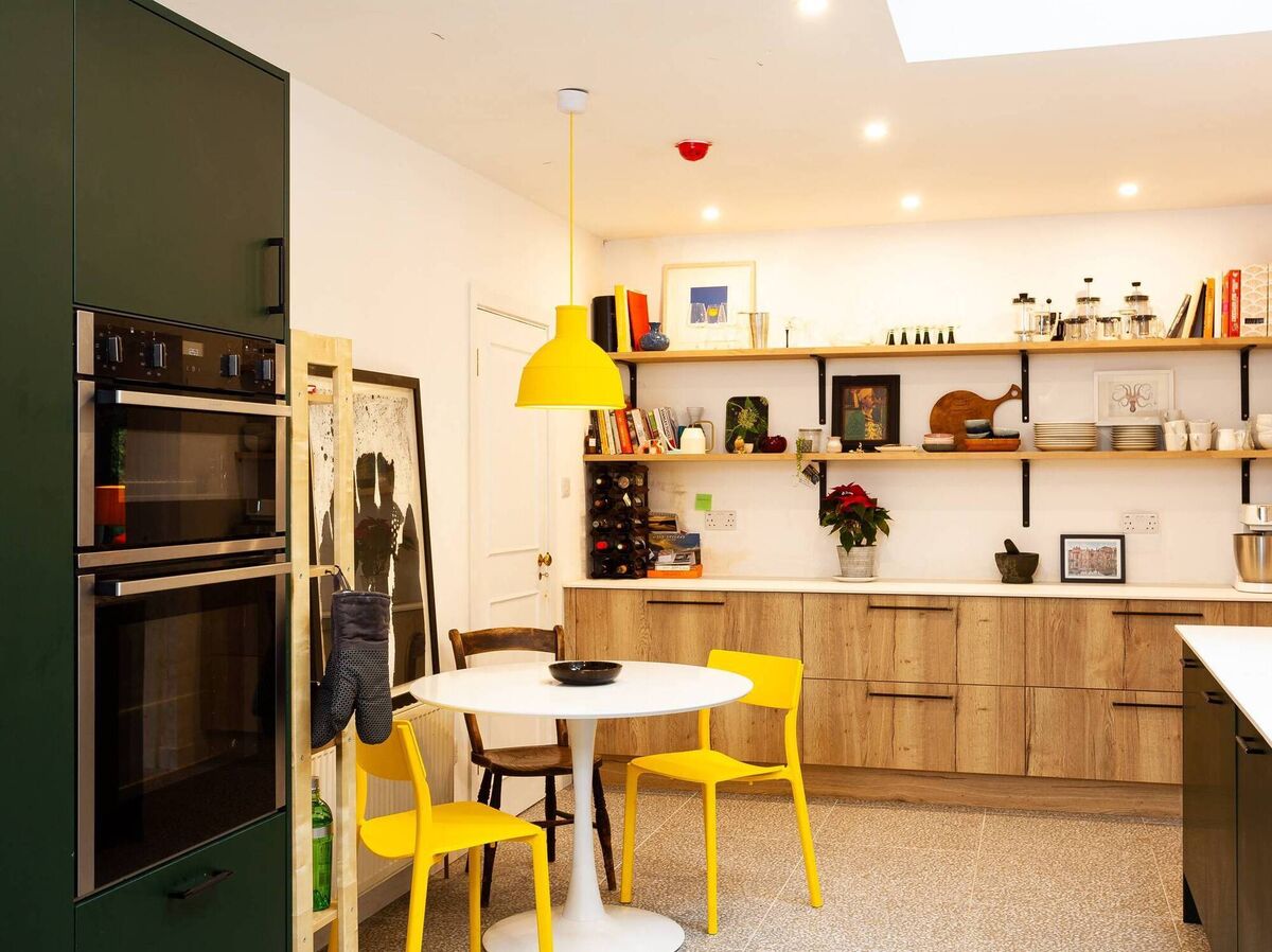 They got a polished concrete kitchen floor effect thanks to a luckily-sourced large tile that replicates the finish, and they crafted their own open shelving for display and cookery books by simply getting a long length of oak kitchen worktops they liked, and cutting along the length in the middle for a nice and useful depth.