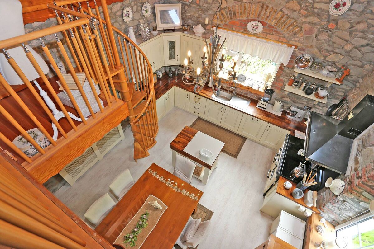 The quality of the carpentry can be seen in the staircases — one an open tread one made of logs and the other a spiral one curving its way up to a galleried mezzanine. The space in the original stone cottage has been used to create a high ceilinged kitchen diner with exposed stone and timber and cream country style units. In the extension there’s a sitting room where a redbrick chimney breast and ceiling beams create a traditional appearance.
