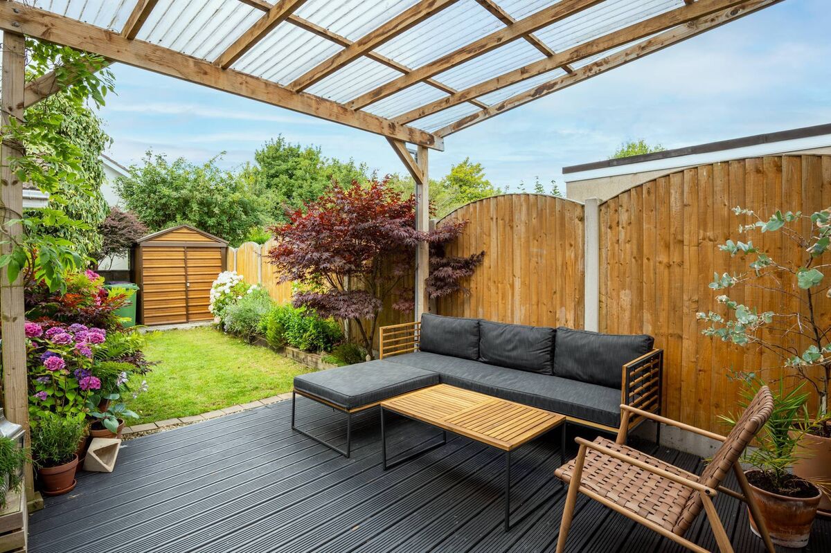 The back garden has also been given a makeover and has a covered patio, which makes a good dining/relaxing outdoors space, as well as a lawned garden with raised beds and a steel shed.