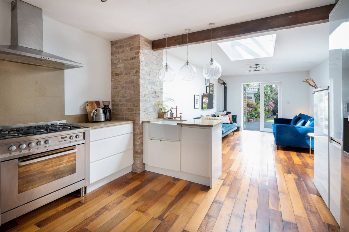 The renovations involved opening up the space and creating a long kitchen-dining living room with Acacia timber flooring, sleek white kitchen units with a Belfast sink, exposed stone work and ceiling beams and also the addition of a skylight and a stove.
