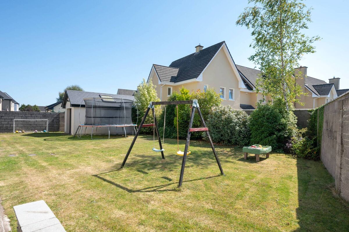 As the patio is to the side of the property, it leaves plenty room out back for lawn (soccer), a trampoline and swings, and a detached garage. The property is not overlooked. Houses to the rear (there are a variety of house types in Grange Manor) are at right angles to it and it faces onto green fields. A large driveway, entered via electronic gates, means off-street parking is plentiful.