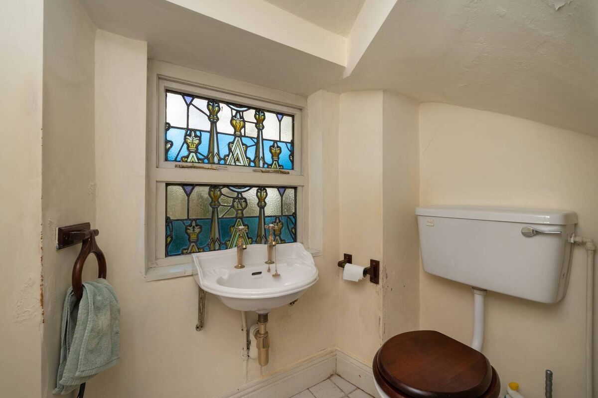There’s a guest WC with a quirky, coloured-glass window, with designs that look like pieces of a chess set, off the back hallway, under the stairs.