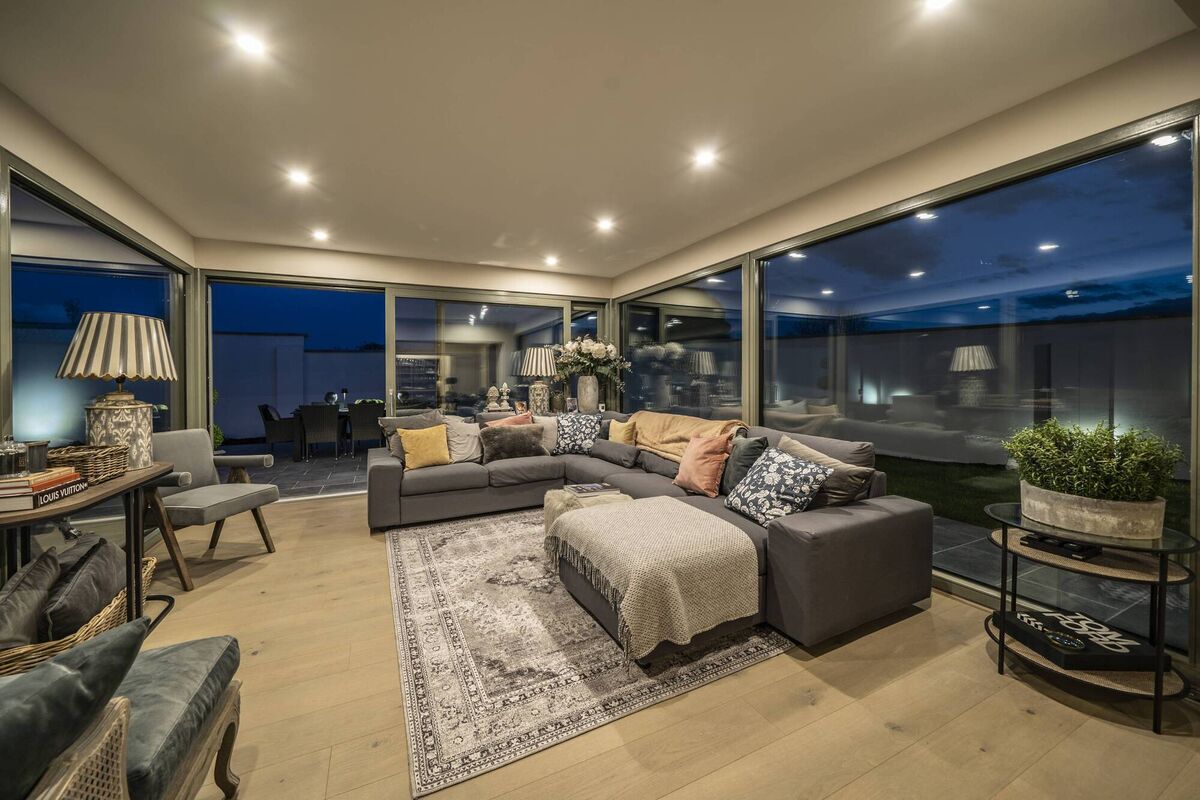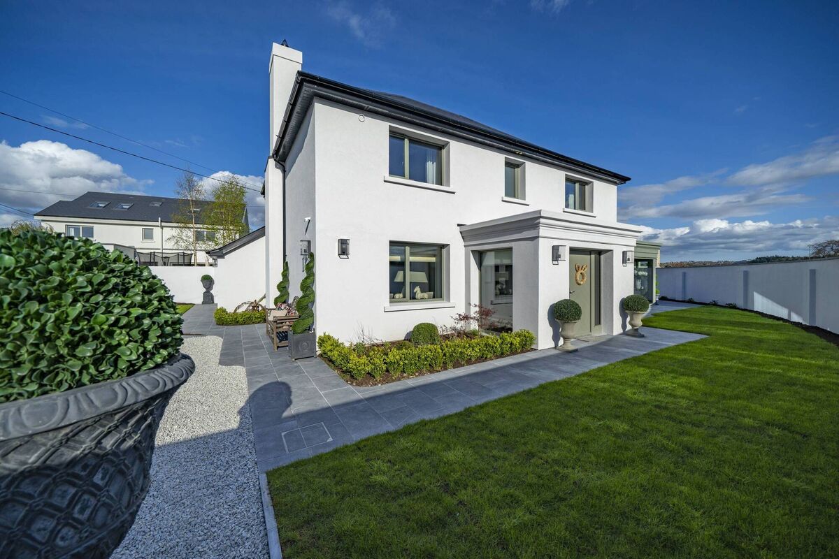 A driveway lined with chippings has space for several cars past the enclosed front lawn, with vast amounts of quality limestone paving acting then as a ‘skirt’ surrounding the house and its patios, skillfully laid by Jodie Lane, while landscaping at the perimeter is credited to Paul Murphy of Abbey Landscaping, all taking root with lawned areas front and back.