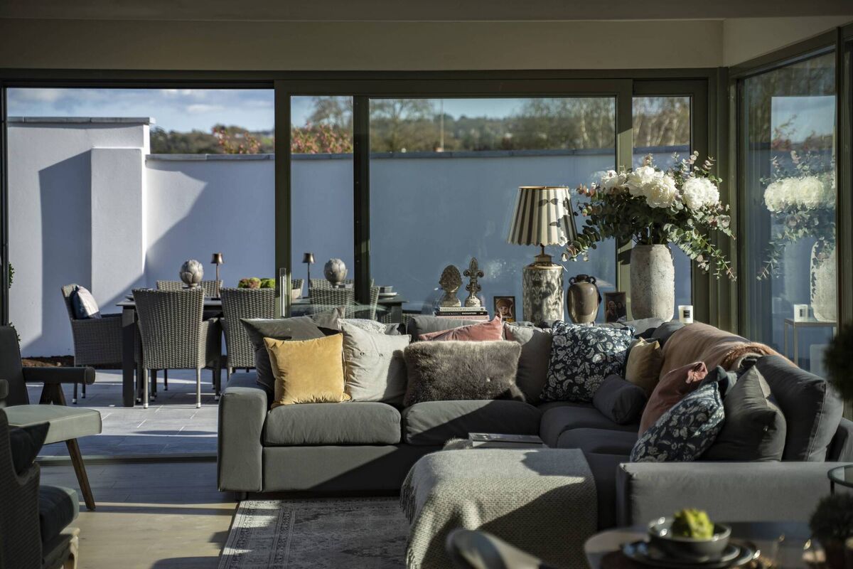 The porch entrance, flanked by full-height windows either side of the door, has a flat roof, in long-lasting fiberglass, with a moulded ogee pediment offer as a nod to classical design, and the same ogee finish (done by Passive Sills in Youghal) is seen to even better effect on the surround of the similar flat, fibreglass roof over the added on-sun room.