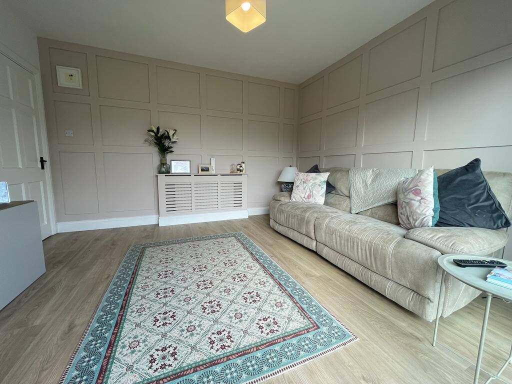 The separate sitting room/playroom overlooks the rear garden and it too is tastefully done, with dusky pink wood-panelling on two walls (Colourtrend Lowland) and double doors to patio/garden.