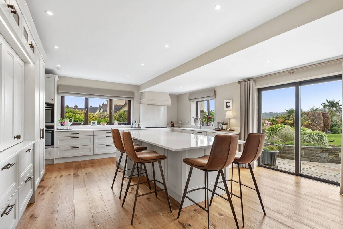 Before you start salivating over the Calacatta Gold Quartz giant island worktop (3m x 1.3m) your eyes will be drawn to the view beyond the dining area’s glazed back wall, and down towards the shoreline at the bottom of the garden, where the Owenabue river flows into the estuary, before making its way towards Crosshaven, passing through heavenly Drake’s Pool, a popular mooring spot, and on past the world’s oldest yacht club, the RCYC.