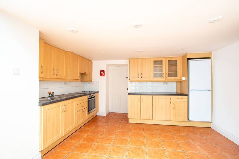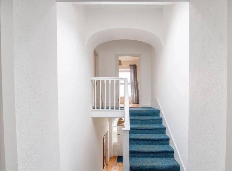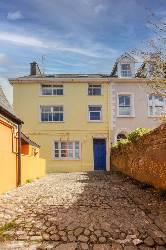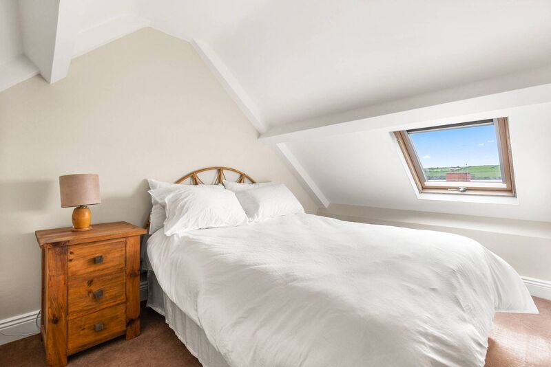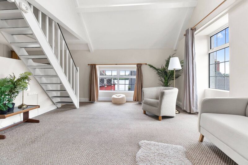 Situated on the second floor of a semi-detached Georgian house, it’s a bright, one-bed apartment with a high vaulted ceiling and large windows that look out across nearby rooftops to the harbour and the town.
