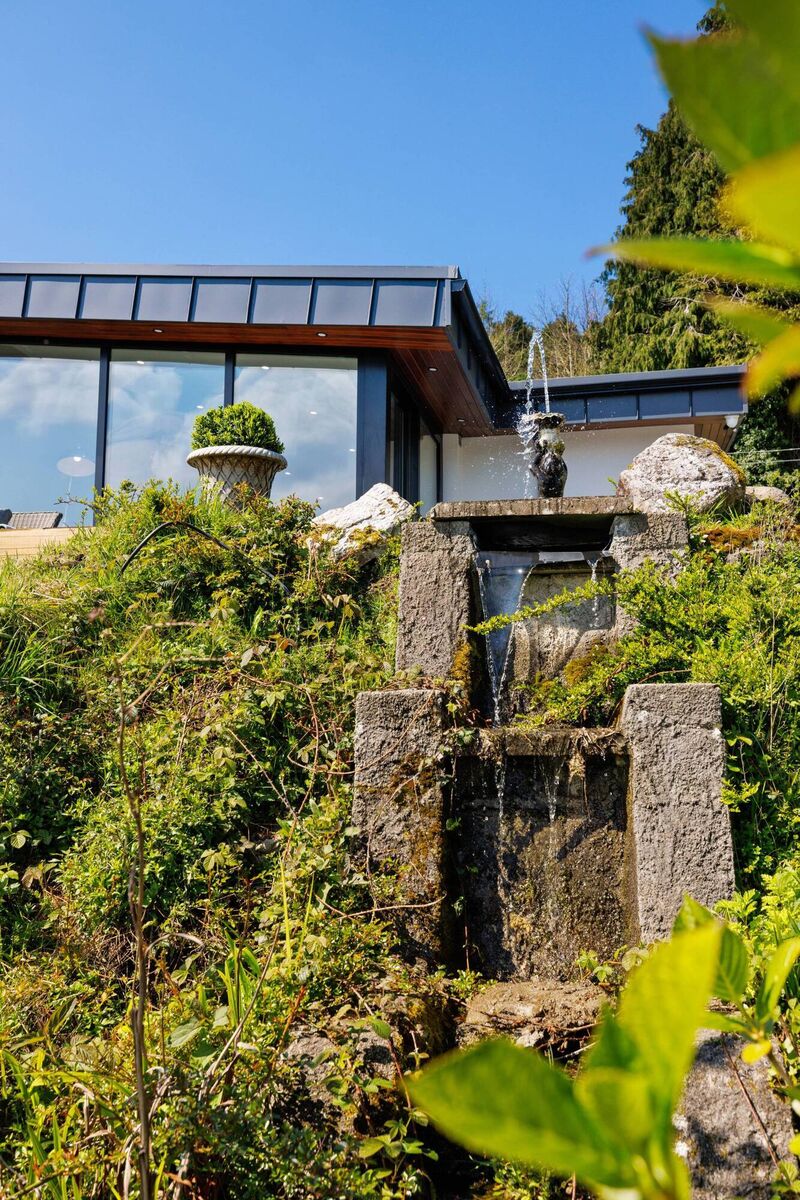 In fact the “no expense spared” approach is evident from the electric entrance gate off Mountain Road, (which picks up on the cedar wood theme), and carries right through the extensively landscaped grounds around the house, where native trees and shrubs are in abundance; where an extended limestone southeast-facing terrace takes full advantage of those sweeping views; where two water features add to the sense of serenity; and where steps lead down to a lower garden and a long pond with a recycling water flow system.