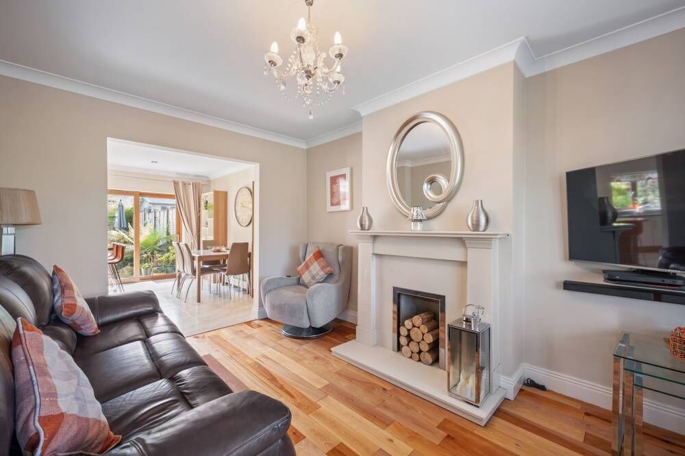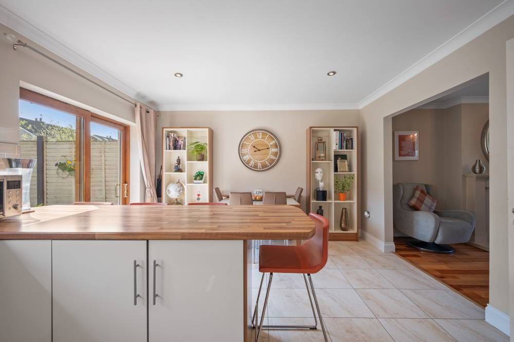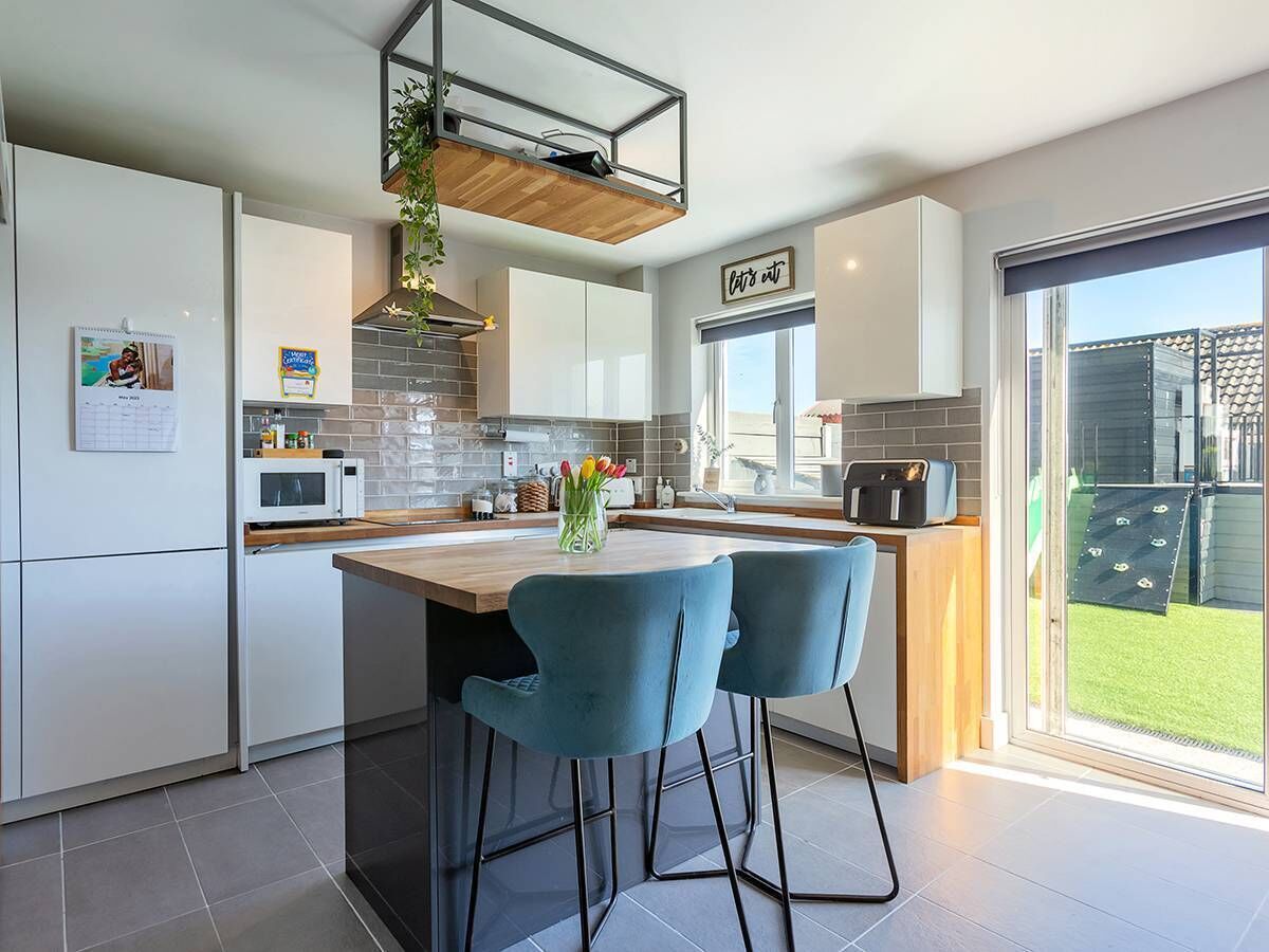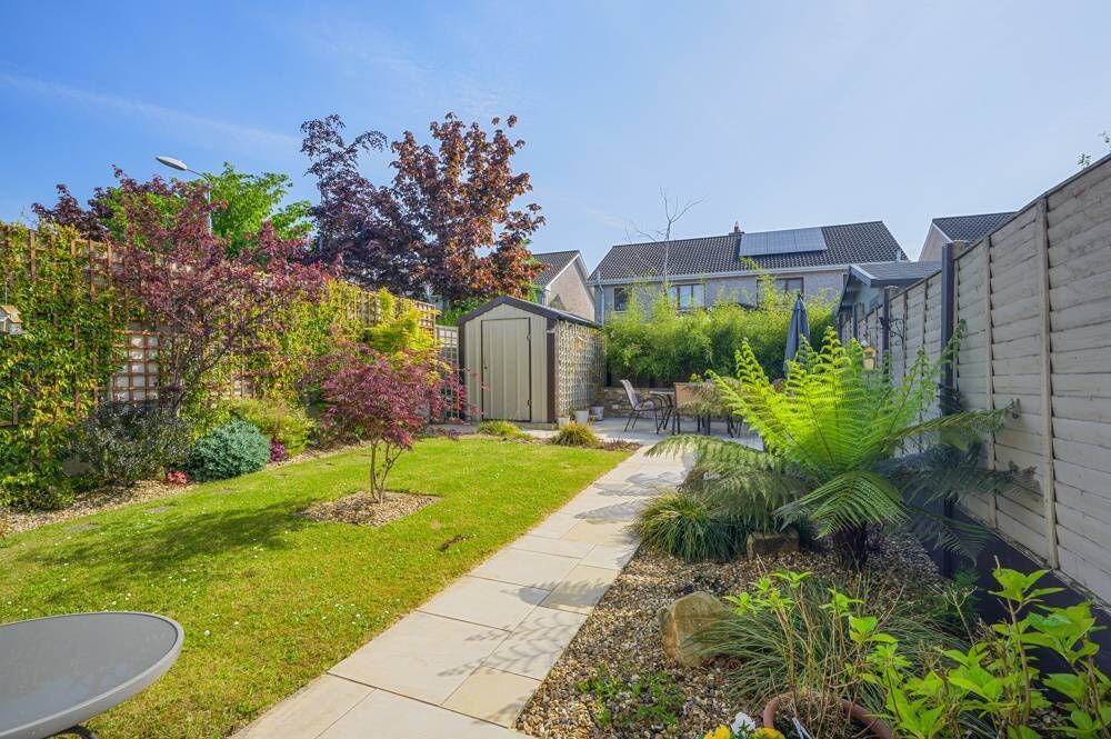 Offering 92 sq m of bright, modern living space, the property has a timber-floored living room connected by an archway at the rear with a tiled kitchen-diner with high gloss cream units and a breakfast bar. Off the hallway there’s a guest WC while upstairs there’s an upgraded bathroom and three bedrooms with built-in units and semi-solid oak flooring. To the rear the property has a good-sized garden with a sandstone path and patio, a trellised climber covered wall and a Steeltech shed as well as gravelled beds and a lawned area.