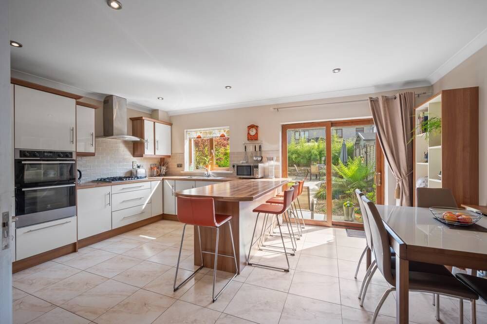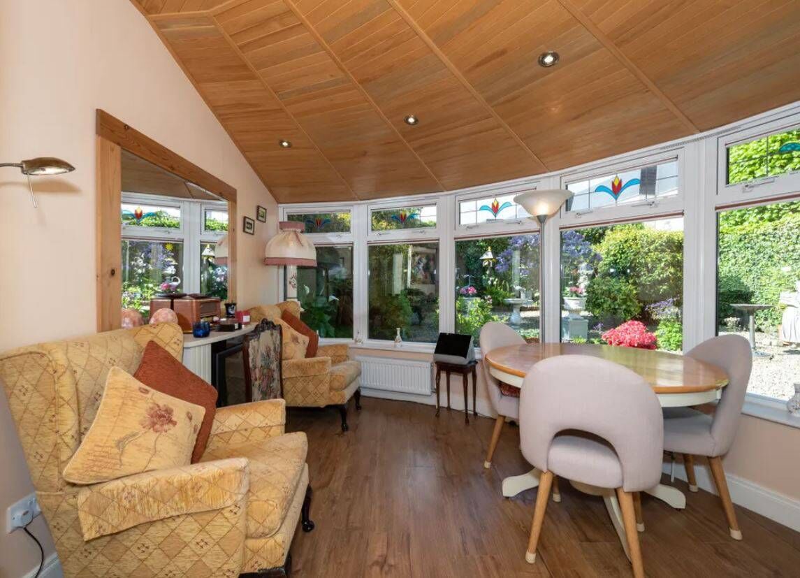 Accommodation includes a long, open-plan living room/dining room, with a set of double doors at the rear opening into a sunroom, which serves as an everyday eating space. Off the dining room is a small, brightly coloured modern kitchenette.