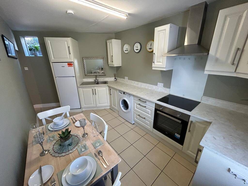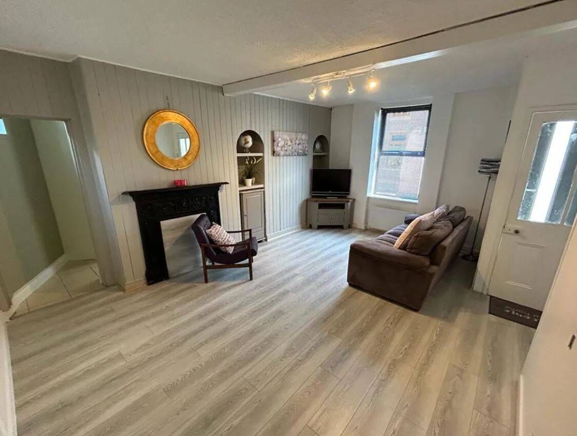 Accommodation includes a modern living room with a large shuttered window and an insert electric fire, as well as a kitchen/diner with grey units, a breakfast counter, herring bone flooring, and double patio doors.