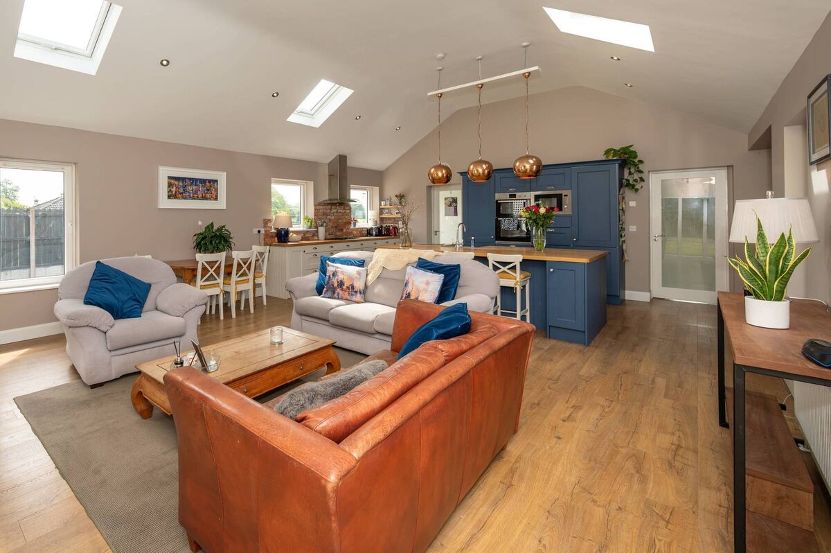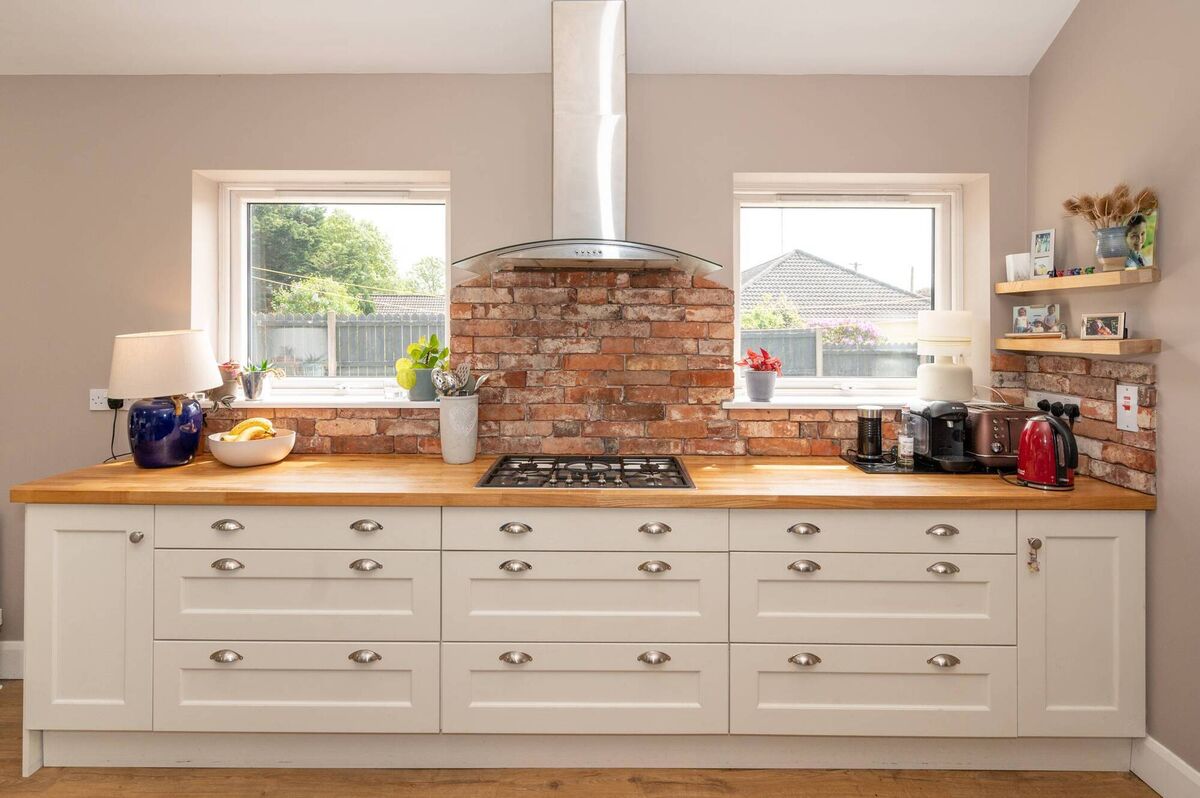 Norma Healy of Sherry FitzGerald, who is handling the sale of the house, says the open plan room “is a fantastic space with all of the practical elements it offers for a family”. She points out a number of highlights, including the recently fitted SMEG 5 gas ring cooker top, an island with a Belfast sink, attractive suspended copper lighting, and the warm, sealed, brick splashback.
