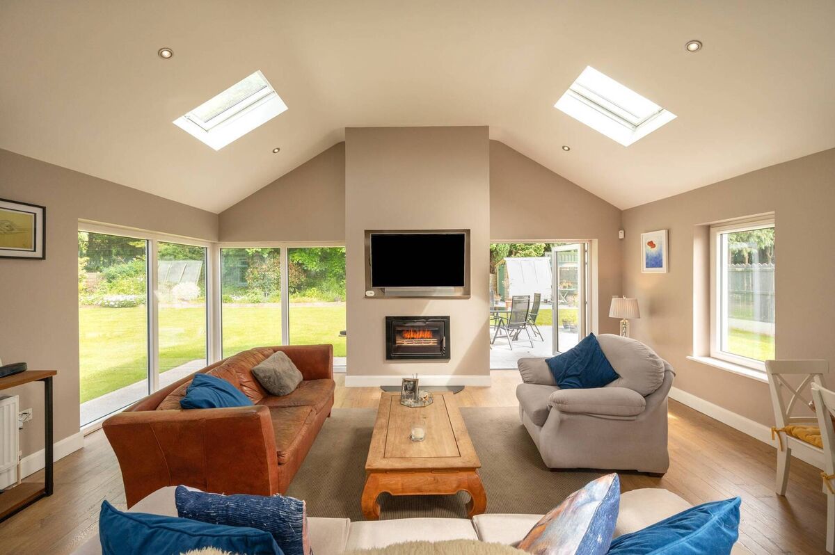 The glazing is what makes it though: the floor to ceiling windows that join at right angles in one corner of the room, offering up full garden views; the double doors that open to a new limestone patio, the four overhead veluxes that draw so much light in.