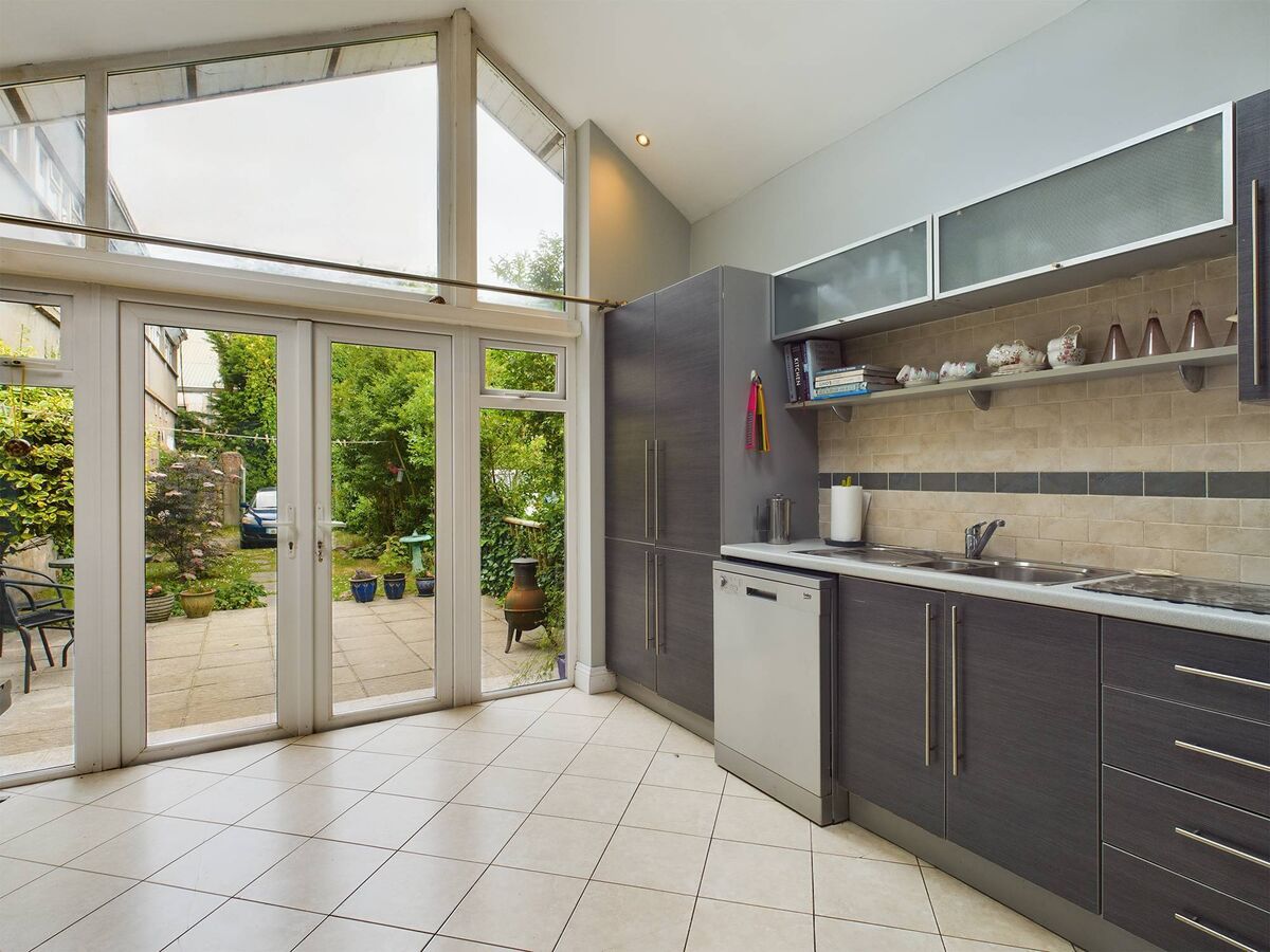 At entrance level the semi-detached house has a living room with a high ceiling as well as a guest WC. The basement, which was once the servants domain, has a sitting room and a WC/ utility room and study used as a potter’s studio. At the rear there’s a contemporary kitchen-diner with one fully glazed wall.