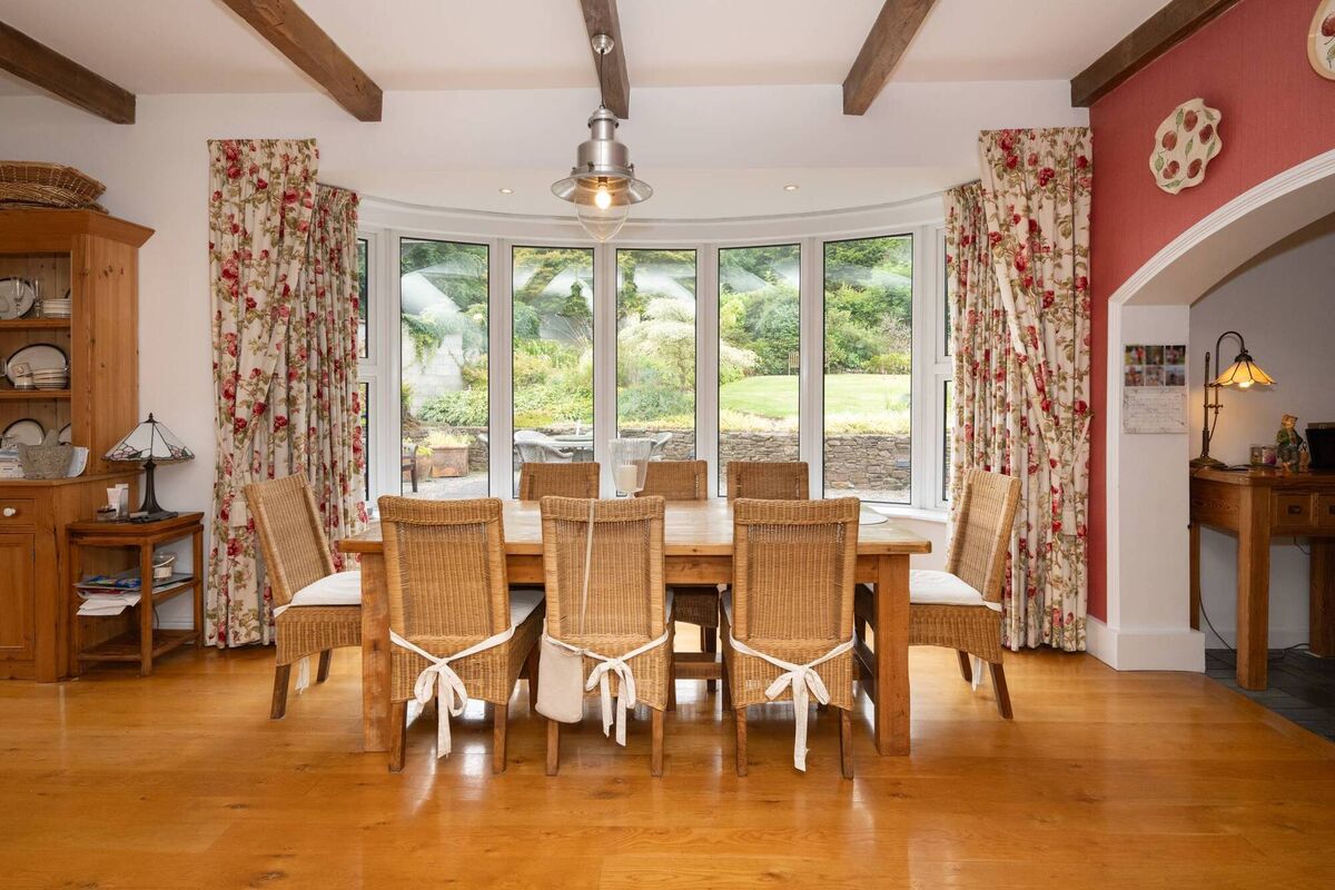 Those rooms (with some internal spilt levels) include a front sitting room, with beamed ceiling (the bedroom directly above also has ceiling beams) and fireplace, a very large kitchen/casual dining room, more formal dining room, a family room with stove, and a back hall/ office leading to a gable end en suite bedroom, as well as large sun room with floor-to-ceiling windows looking over the rear garden and one of the several patios/sit out spots.