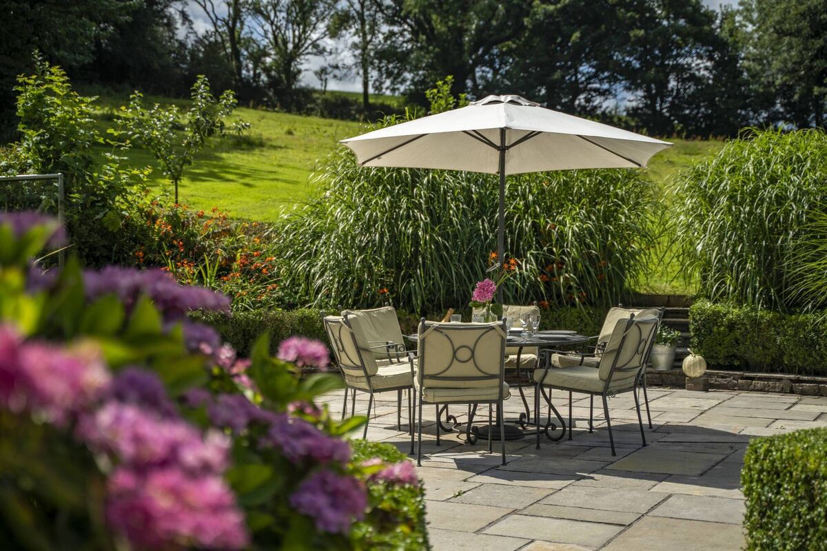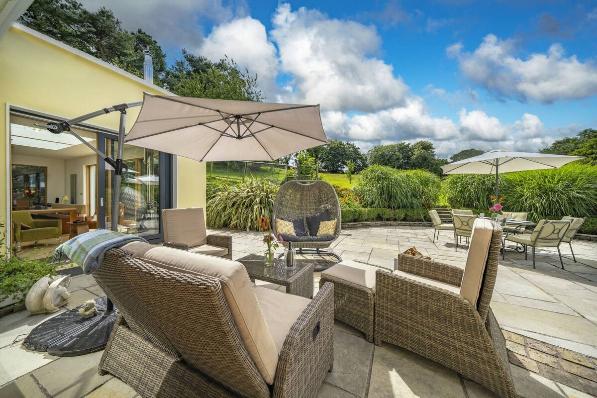 Visitors and residents alike arrive on the eastern side on the now enlarged and reconstructed property where little is given away as to the size, scale and quality within, with pale gravel turning circle by an impressively large, double lofted garage/workshop with a window at its back wall giving an unexpected sweep of views to the tree-ed boundary, circular garden path which rings it, and there’s a suite of raised vegetable beds then to the side in a sheltered side garden.