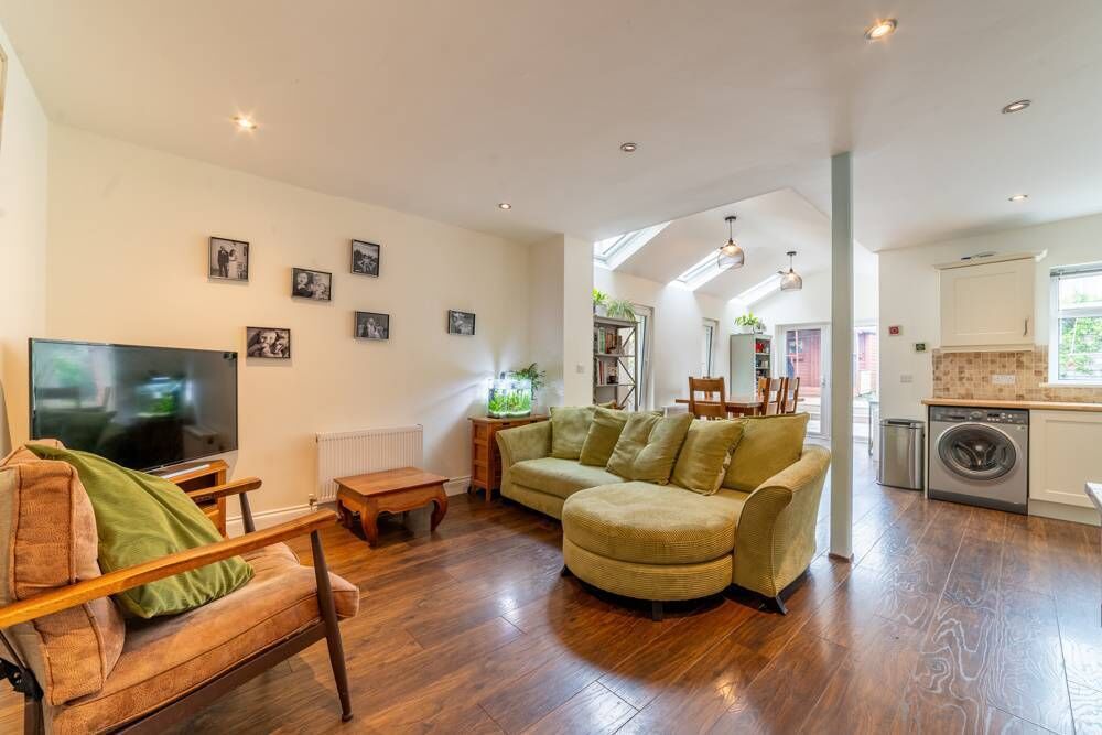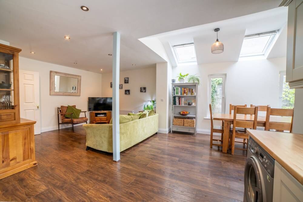 That second owner pushed it out at the rear, to create a spacious, airy kitchen/dining/living area, where a glut of glazing lets in a wealth of natural light.